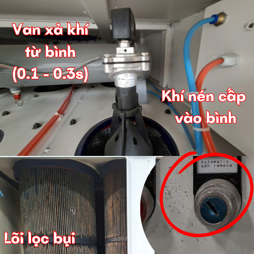 3️⃣ Van mở tức thời → khí nén từ bình chứa thổi mạnh vào filter