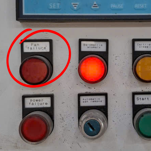 Mọi cảnh báo (nhiệt, áp, tắc lọc, quá tải quạt) sẽ hiển thị qua đèn báo tương ứng. - When Start Up is pressed, the main fan motor starts → creating suction airflow that draws smoke and dust through the filters.