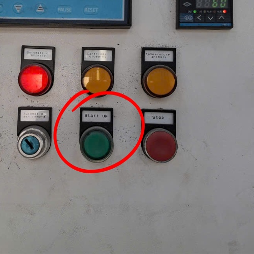 System start button – activates fan, filtration system, and cleaning sequence.