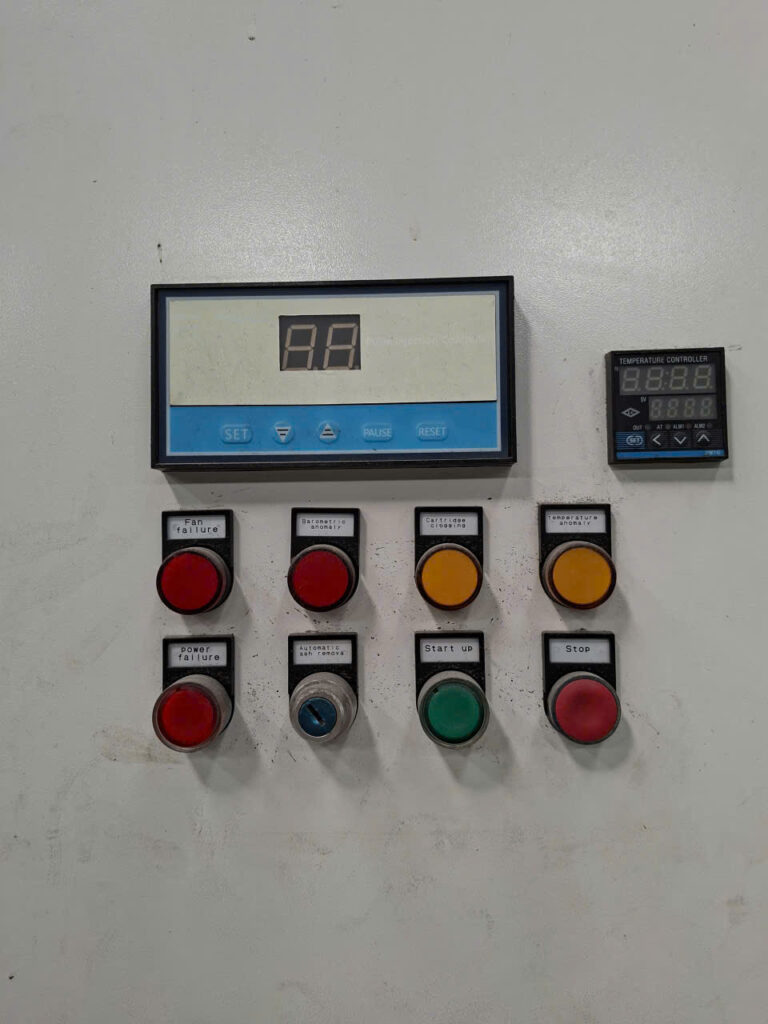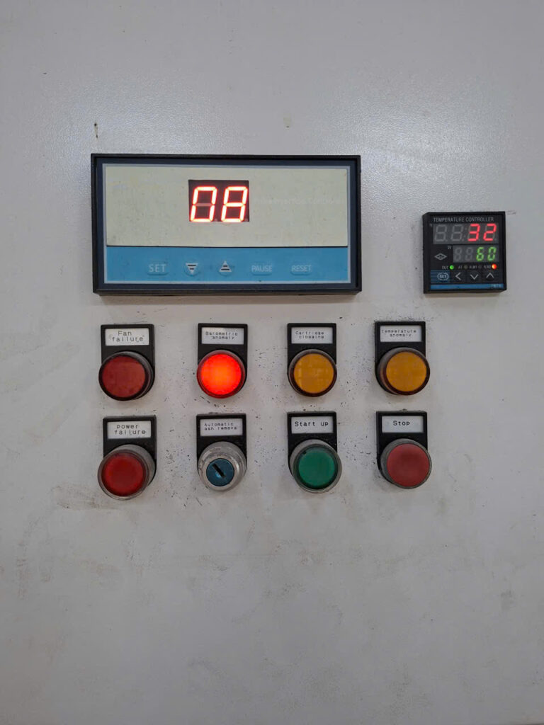 Nút khởi động toàn hệ thống – quạt hút, bộ lọc, và hệ thống xung làm sạch.