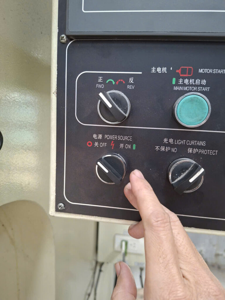| 9️⃣ Nhấn Main Motor Start, motor chính chạy, đèn xanh sáng → Press Main Motor Start, main motor runs, green light on |